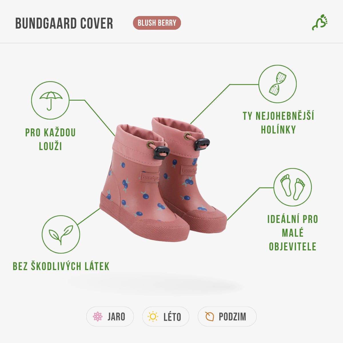 Cover jsou ultralehké a pružné holínky navržené speciálně pro nejmenší děti, které se začínají stavět, chodit a objevovat svět kolem sebe. Vyrobeny jsou z měkké přírodní gumy bez škodlivých chemikálií a mají rovnou, flexibilní podrážku, která podporuje přirozený pohyb a postavení dětské nožky.