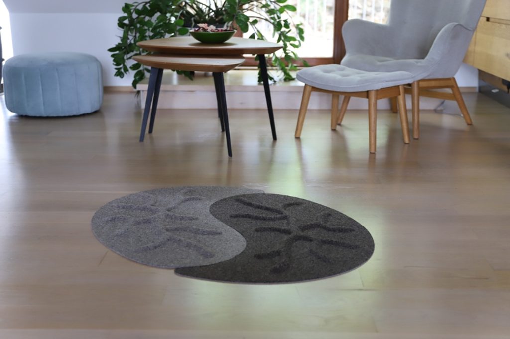 The RootyRUG Yin Yang root rug brings a sense of balance and relaxation to the space with its shape and colour.